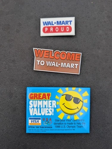 Vintage 80s 90s Walmart Employee Name Tag Pins Badge Welcome Proud 1996 Olympics