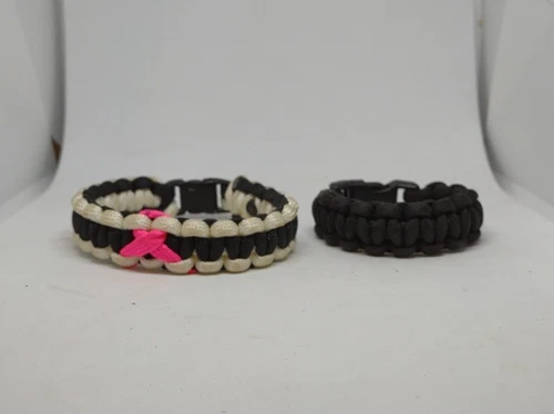 550 Paracord Survival Bracelet White/Pink/Blk 8" & Black Mini 5" Clip Lot of 2
