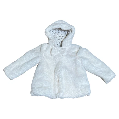 Girls “Little Me” Jacket White Faux Fur Hooded Coat Bow Zip Closure, 24 Months