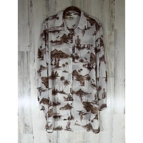 Alkemy Button Down Sheer Blouse XL White Brown Desert Landscape Western Toile