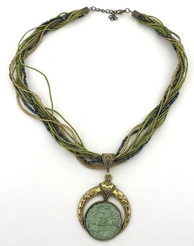 Boho Multi Strand Necklace Green Resin Pendant Gold Tone Statement Bib 21 in