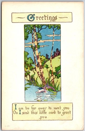 Greetings, Scenic Birch Trees by River Friensdhip Poetic Verse, Vintage Postcard