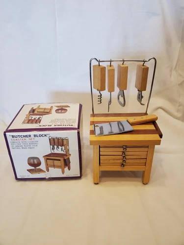 Butcher Block Vintage 1978 Enesco Coaster Set 6 Coasters 4 Bar Tools Knife, NIB