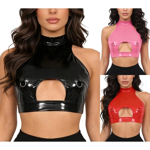 Womens Crop Top Clubwear Tank Top Lace-up Camisole Backless Shiny Nightclub