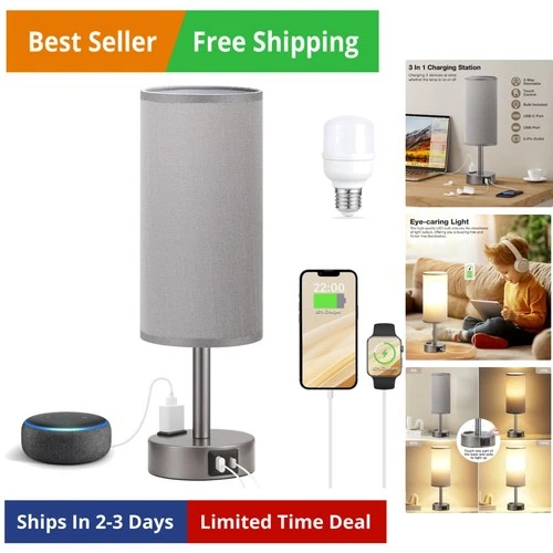 Grey Bedside Table Lamp for Bedroom - 3 Way Dimmable Touch Lamp USB C Chargin...