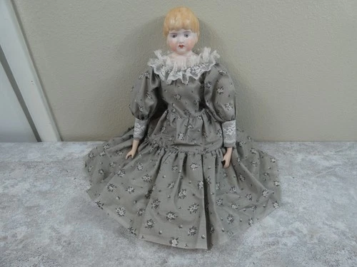 Vintage Doll Porcelain Bisque Molded Blond Hair Blue 22 Inch Germany Grey Dress