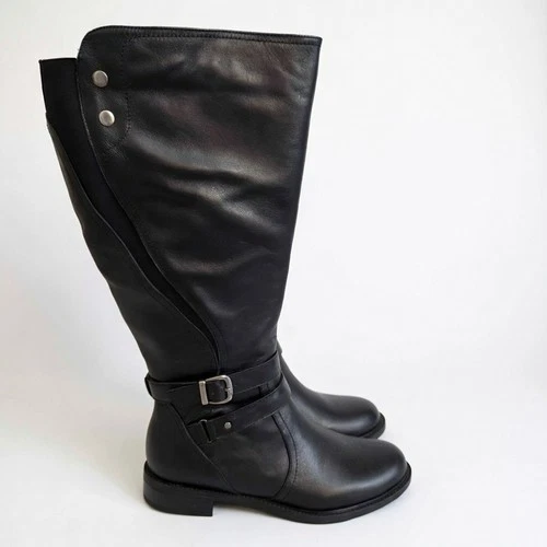 David Tate Black Leather Tall Knee High Boots Side Zip Buckle 10 Extra Wide Calf