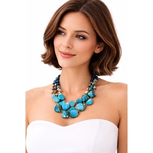 New York & Co Blue Beaded Shell Multi Strand Statement Necklace Silver Tone J-01