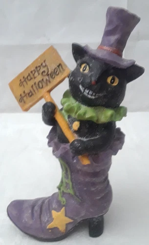 Vintage Happy Halloween Sign Black Cat in a Shoe Figurine 8.5 in
