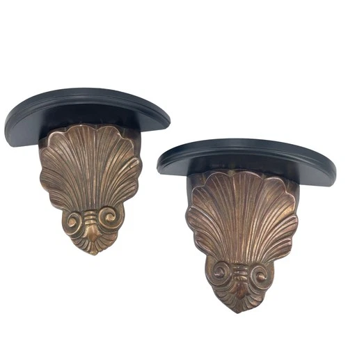 Vtg 1992 Brass Shell Corbel Wall Shelves Pair Black Wood Top Hollywood Regency