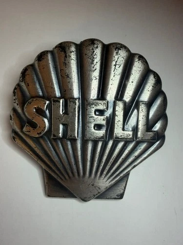 1940s Vintage SHELL OIL CO. Gas Station cast medal pump badge original mounting