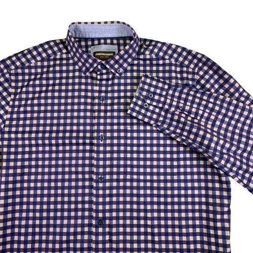 Johnston & Murphy Mens Large Navy Blue Tan Gingham Cotton Button Down Shirt L
