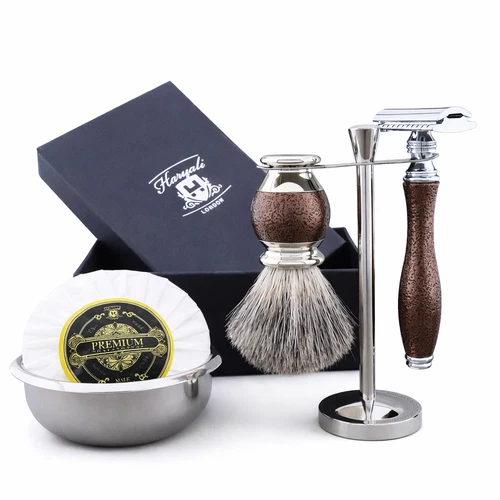 5pcs Maroon Antique Shaving Kit with Badger Hair Shaving Brush & DE Safety Razor