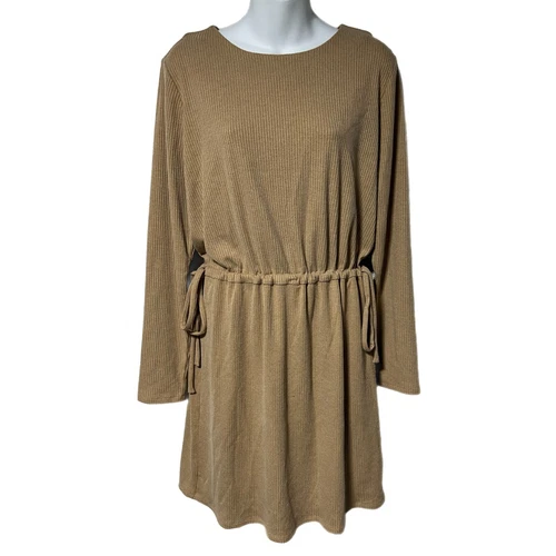 Charles Henry Camel Tan Ribbed Cinch Tie Waist Long Sleeve Dress L Neutral Nude