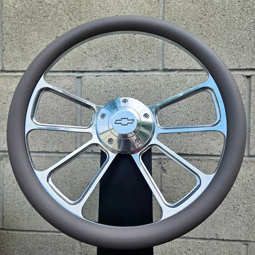 14" Polished Steering Wheel Gray Vinyl Half Wrap & Chevy Horn for 1969-94 GM