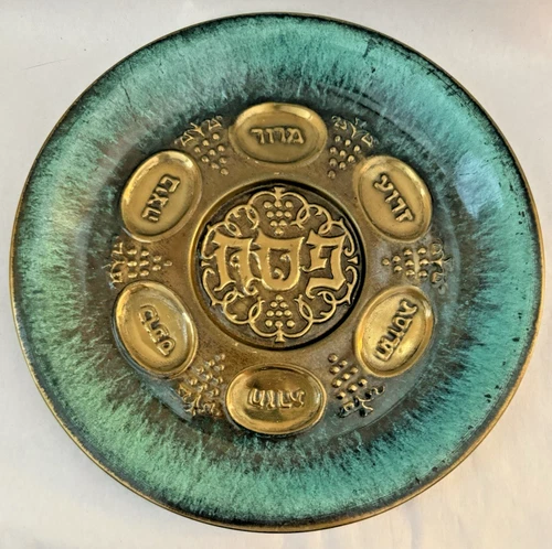 Brass Embossed Seder Jewish Plate with Hebrew and English Enameled 10 inches