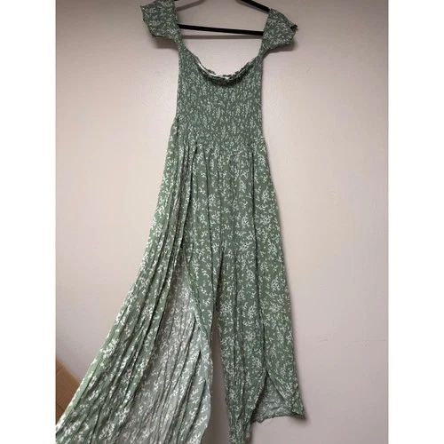 Sugar & Cream Green Floral Jumpsuit Romper Pants Smocked Off Shoulder Women L