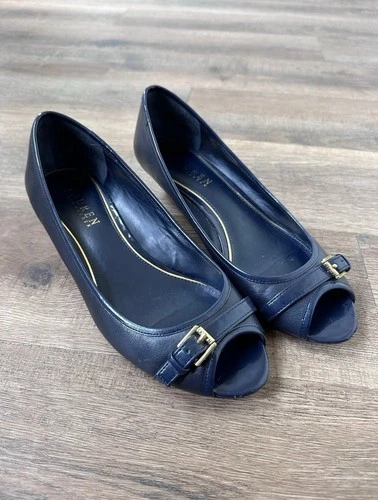 Ralph Lauren Madison Wedge Buckle Slip On Blue Peep Toe Shoes Women's Sz 8.5B