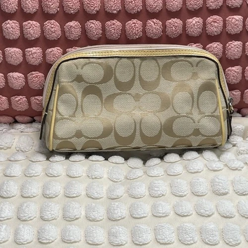 Y2K Coach Makeup Bag Jacquard Fabric Yellow Leather Trim Pink Satin Interior