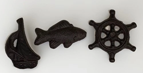 Set Of 3 Cast Iron Nautical Decorative Magnets, Sailboat - Fish - Ships Wheel 3”