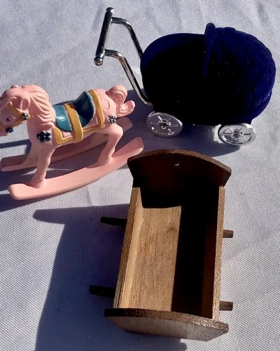 Vtg Lot 1:12 Miniature Nursery Furniture Wood Cradle Rocking Horse Baby Buggy
