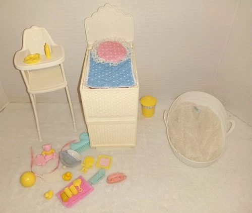Vtg 1984 Barbie Heart Family Baby White Wicker Bassinet Cabinet Highchair &Acc