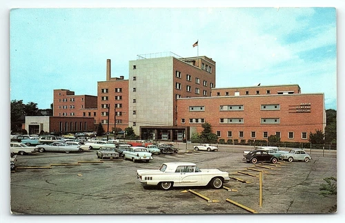 1950s AKRON OHIO GENERAL HOSPITAL PEOPLES HOSPITAL T-BIRD VW BUG POSTCARD P3813