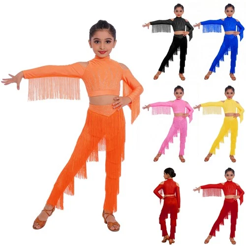 Girls Dancewear Long Sleeves Set Tassels Outfit Latin Modern Crop Top Costume