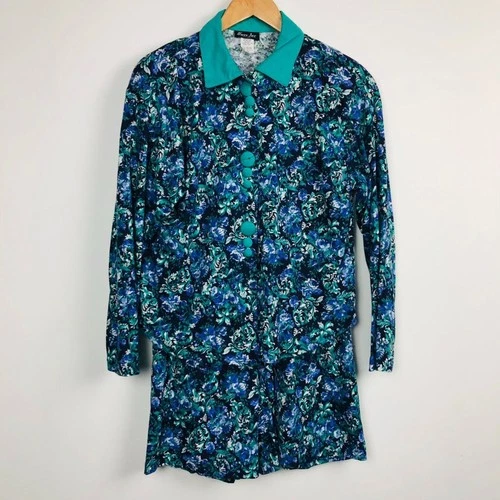 VTG B'way Jrs 2 Piece Set Shorts Long Sleeve Top Floral Print Made in USA Large