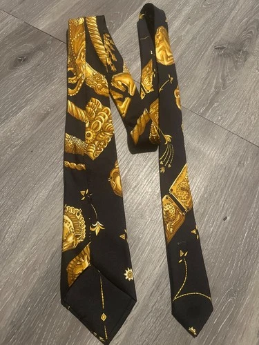 Hermes Paris Silk Tie Black Gold Equestrian Horse Carriage Pattern France 100% S