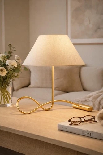 Handmade Brass Loop Table Lamp, Minimalist Gold Linen Shade Bedside Lighting
