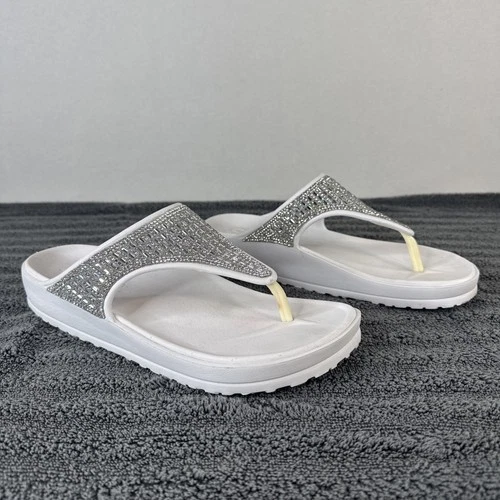 Skechers Luxe Foam Flip Flops White Silver Beaded Platform Sandals 8