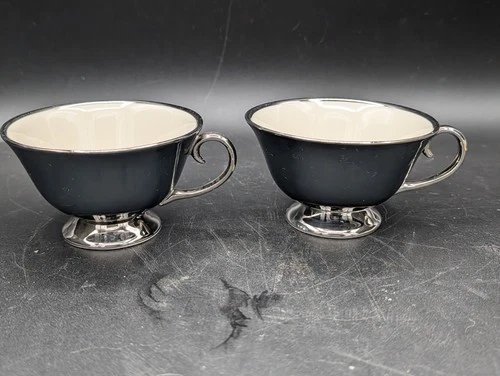 2 Vintage Flintridge Contessa Teal Black Platinum RimTeacups Tea Cups