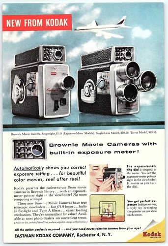 1950s KODAK CAMERAS BROWNIE MOVIE CAMERA BUILT IN METER FULL PAGE PRINT AD Z5303