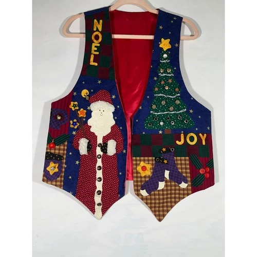 VTG Handmade Womens Christmas Vest Santa Snowman Tree Appliques Holiday Fun Sz L