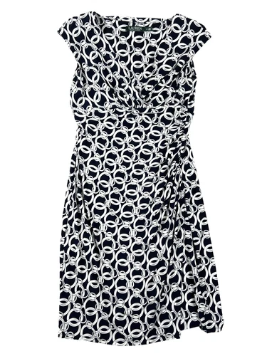 Ralph Lauren Sheath Dress 10 Midi Navy White Chain Ruching Stretch Faux Wrap