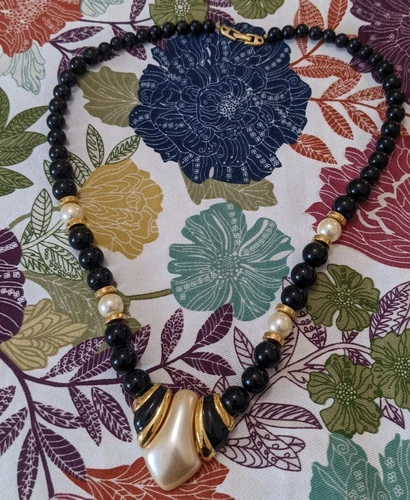 Napier Black & White Beaded Gold Tone Necklace Signed Vintage 24''