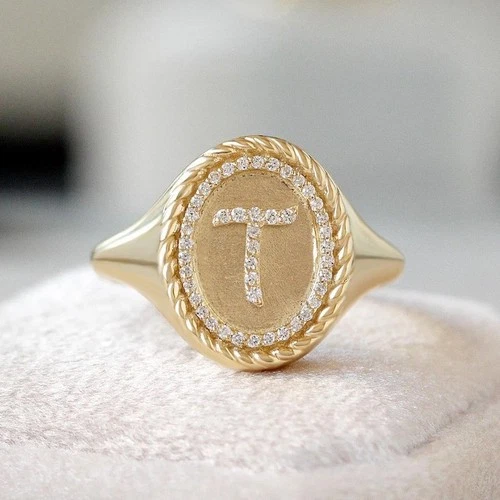 Luxury Personalize Gold Signet Round Cut Moissanite Custom Letter Chunky Ring