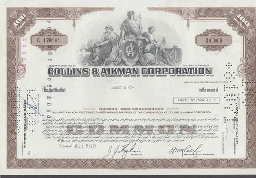 Collins & Aikman Corporation 100-share Stock Certificate 1971 auto cockpits