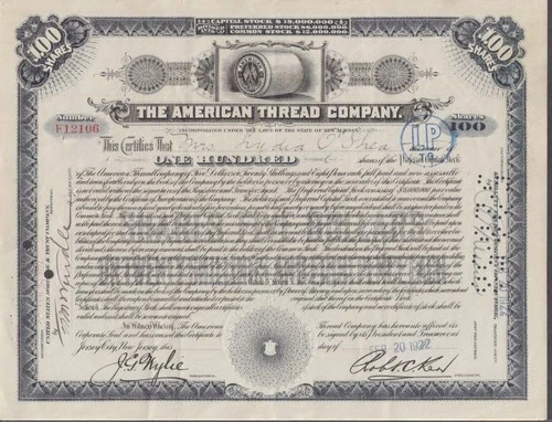American Thread Stock Certificate 100 shares 2/20 1922 Windham CT