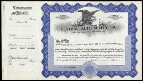 Central Auto Supply unused unissued stock certificate 1960s Connecticut