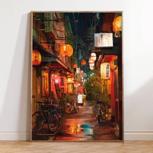 Tokyo Japan Oil Painting Poster Lantern Street Night Scene Wall Art Decor