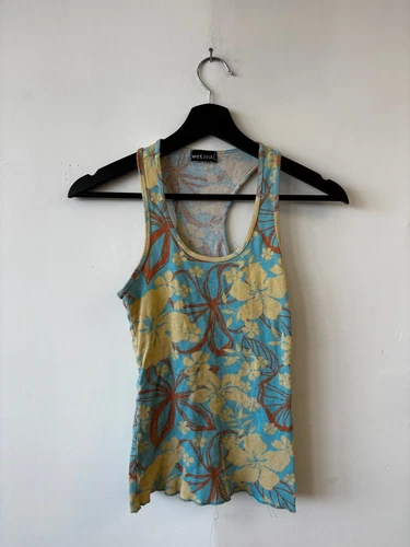 VTG Wet Seal Tank Top Womens XS Blue Yellow Floral Ribbed Racerback Y2K Retro