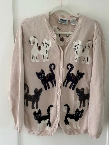 Vintage Northern Reflections cat embroidered cream cardigan sweater size Medium