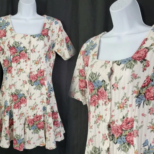 Mameluco vintage Zanoni marfil con flores rosa/azul/verde y escote cuadrado talla M