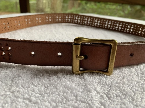 Cinturón de cuero genuino de colección marrón hebilla de latón corte láser mariposas mariposas talla S