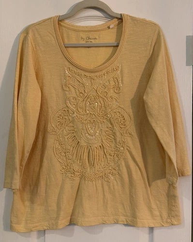 Camiseta amarilla manga 3/4 bordada Chico’s Soutache talla 2 (L)