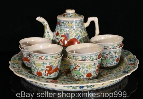 11.4" Antiguo Chino Chenghua Marcado Flor Zodiaco Año Caballo Bandera Taza Plato Set