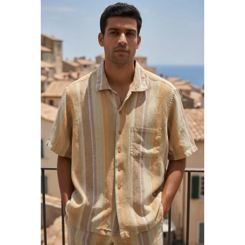 Camisa BUGATCHI UOMO Para Hombres Mezcla de Lino Rayas Manga Corta Abotonada Talla M
