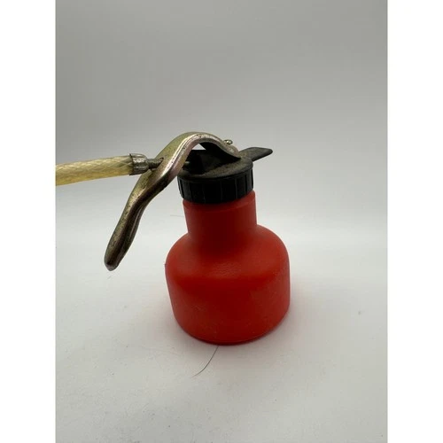 Lubricador de latas de aceite rojo vintage con boquilla de metal y tubo flexible